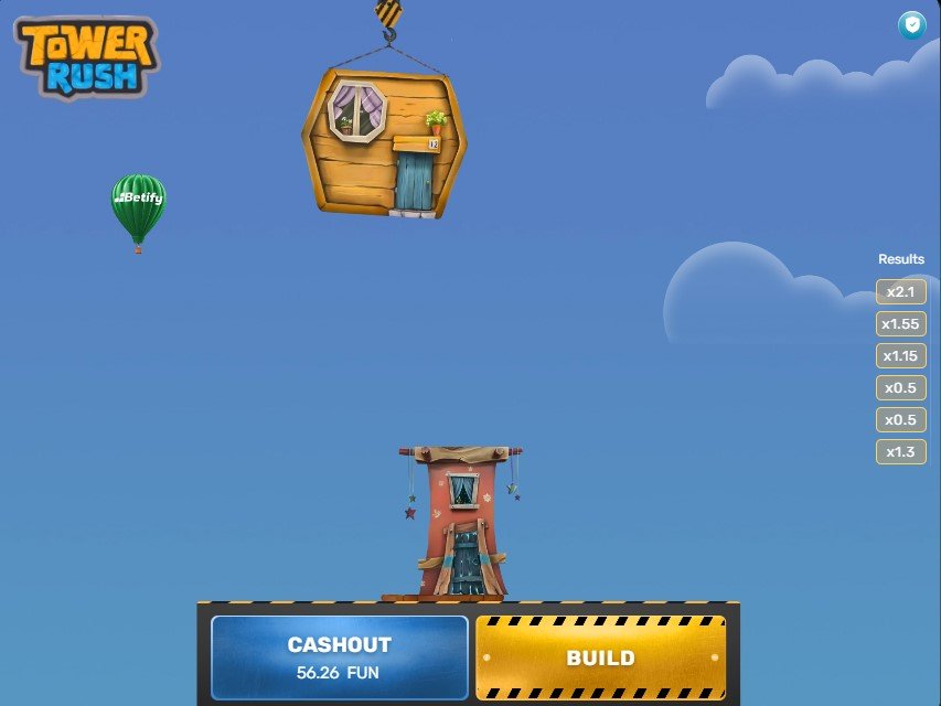 Tower Rush, c’est un concept que je n’avais pas vu ailleurs, et croyez-moi, j’en ai testé des mini-jeux. Oubliez les jeux de crash classiques où vous attendez passivement qu’une courbe monte. Ici, vous êtes acteur à part entière : une grue balance des petites maisons colorées au-dessus d’un socle, et c’est à vous de cliquer au bon moment pour les faire tomber pile sur la précédente. Chaque maison bien posée vous rapporte un multiplicateur aléatoire, qui s’accumule jusqu’à x100 votre mise. Le tout dans un univers graphique loufoque et totalement assumé, digne des meilleurs dessins animés.